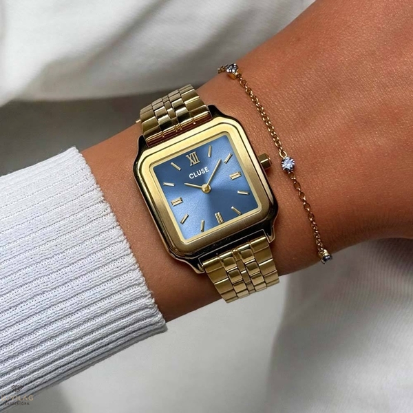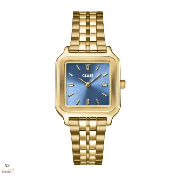 Adjon egy színfoltot megjelenéséhez a női Gracieuse karórával, amely kék és arany színű kyanitból készült. Szögletes, aranyszínű tokkal, 16 mm-es, 5 láncszemes szíjjal és kyanitkék számlappal, hozzá illő koronával.