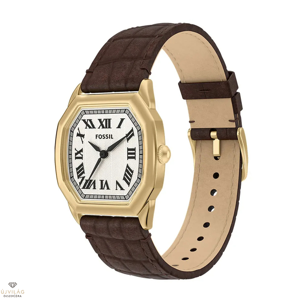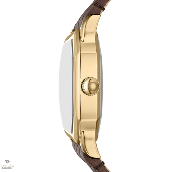 A nyolcszögletű, arany színű tok és a texturált krém színű számlap kifinomult kontrasztot alkot, amelyet a barna krokodilbőr mintázatú bőr szíj még jobban kiemeli. Gondosan megtervezett, vékony profilú óra, amely egyedülálló geometriát és meleg anyagokat ötvöz, így visszafogott, de mégis markáns megjelenést kölcsönöz. A rozsdamentes acél tok szerkezetet és tartósságot biztosít, míg a bőr szíj kényelmes viseletet garantál.