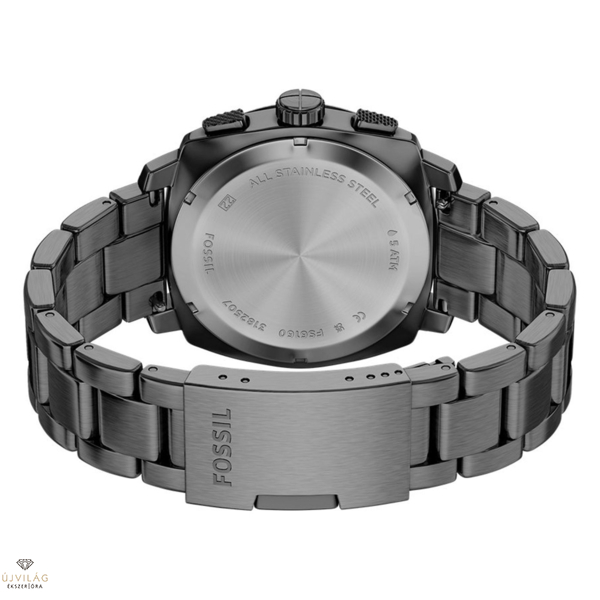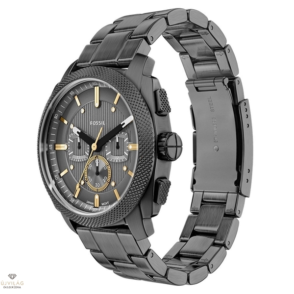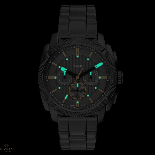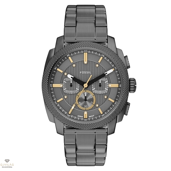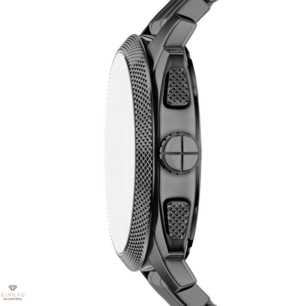 A klasszikus amerikai gépek ihlette Machine Chronograph merész, recézett felsőgyűrűjével vonzza magára a tekinteteket. A 44 mm-es, határozottan férfias tokban egy szálcsiszolt, texturált részletekkel díszített, pisztolyfém színű számlap található, amelyet ásványi üveg véd. A precíziós kvarc kronográf szerkezetű, strapabíró óra tartós, pisztolyfém színű rozsdamentes acél karkötővel készült. Az ipari stílusú formatervezés igazi kiemelkedő példája.