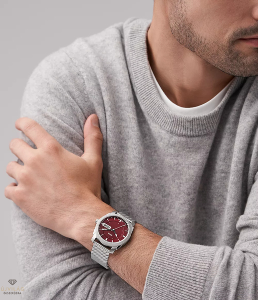 Az amerikai gyártás és innováció csúcsa, hiszen olyan design részletek láthatóak a szerkezeten, amelyeket az ipar inspirált, mint például a csavarfejes korona kombinálása a kifinomult bíborvörös napfényes számlappal és a rozsdamentes acélhálós szíjjal. A számlapot körülvevő bordázott textúra azonnal felismerhetővé teszi ezt a darabot.