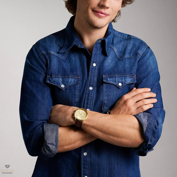 Ez a kronográf a század közepi építészet elemeit felvonultató, kiegyensúlyozott szerkezetű, minimál pezsgőszínű napfényes számlapjával és aranyszínű rozsdamentes acélból készült, faragott tokjával díszített kronográf. A domború ásványi kristály és a precíz japán óramű pontosságot és ikonikus stílust kölcsönöz ennek a kiemelkedő időmérőnek.