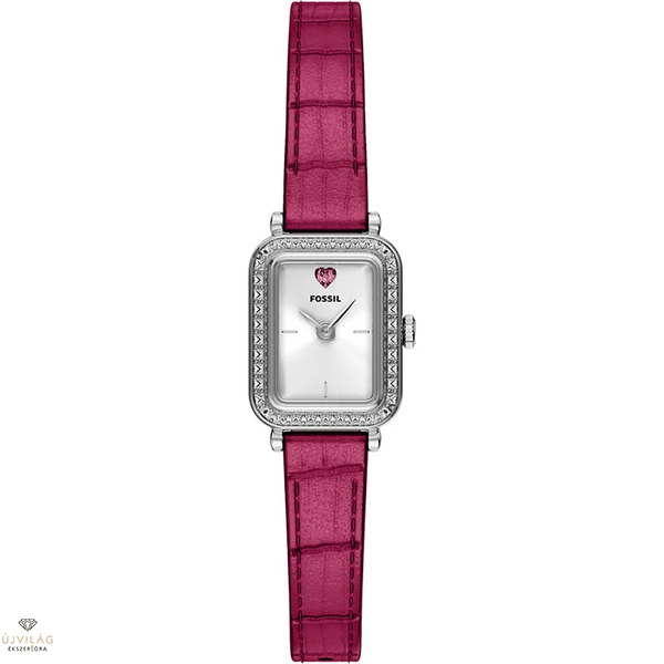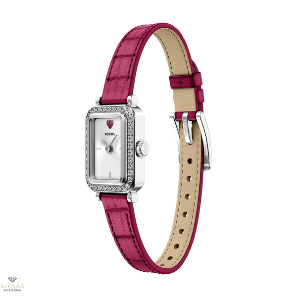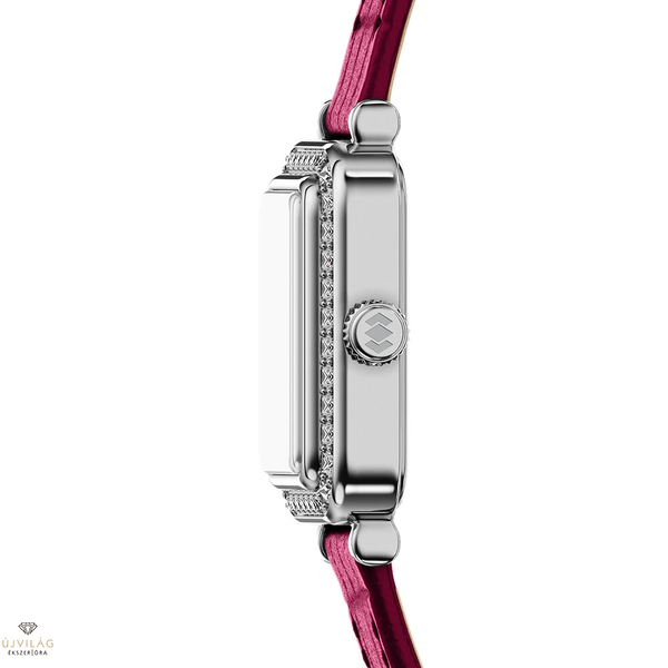 Az ezüstszínű, téglalap alakú tok egy letisztult, ezüst színű, napsugárszerű mintázatú számlapot keretez, így a textúra és a fényesség kifinomult egyensúlyát teremtve. A számlapon található piros, szív alakú kő bájos, egyedi hangulatot kölcsönöz az órának, ami igazán különlegessé teszi. A sima, rózsaszín bőr szíj lágy, visszafogott megjelenést kölcsönöz, és egykaros csat segítségével könnyen állítható.