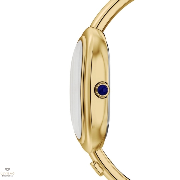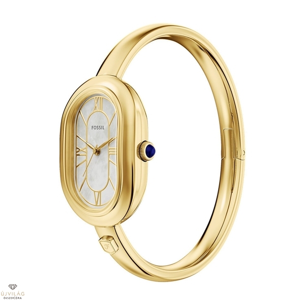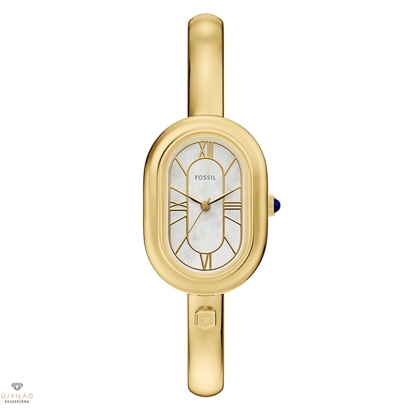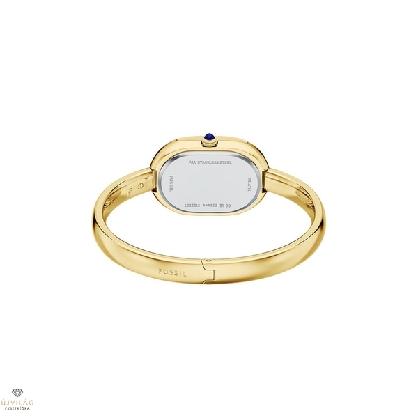 Az arany színű, ékszeres stílusú rozsdamentes acél karkötő tökéletesen illeszkedik az ovális tokhoz, így egy letisztult és kifinomult karkötőóra jön létre. A fényes gyöngyház számlap, amelyet arany színű mutatók és indexek díszítenek, még jobban kiemeli az óra ragyogó eleganciáját és harmonikus kialakítását. A karkötő kényelmes nyomógombos zárral rendelkezik, amelyre a Fossil pajzs logója van gravírozva, így könnyen fel- és levehető.