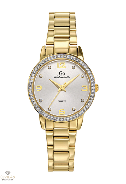 A GO órák világa friss, színes és harmonikus - a francia divatmárka modelljei letisztult eleganciát képviselnek. A tok sárga arany színű IPG bevonattal ellátott fémötvözet, átmérője 30 mm, körben 3 mm széles a kövezett lünett. Számlapja krém árnyalatú pezsgő szín, 4 darab arab számos és 8 cirkónia kővel jelölt indexszel. A nemesacél fémszíj szélessége 14 mm, mely biztonsági zárral kapcsolódik. Az üvege keményített ásványi üveg, mely ellenáll az enyhe súrlódásoknak, azok nem hagynak rajta nyomot. Japán Miyota 2035 szerkezet garantálja a megbízható pontosságot. Az óra szigetelése cseppálló, mely a kézmosáskor, esőben esetlegesen ráfröccsenő cseppektől véd, de vízbe nem vihető!