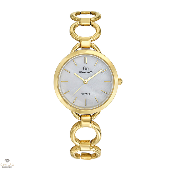 A GO órák világa friss, színes és harmonikus - a francia divatmárka modelljei letisztult eleganciát képviselnek. A tok és a hagyományos ékszercsat sárga arany színű IPG bevonattal ellátott fémötvözet, a tok átmérője 30 mm. A fémszíjból 2 darab csatzár kivehető, így könnyedén, magunknak is méretre igazítható. Fehér gyöngyház számlapján arany színűek az indexek és az óramutatók. Az üvege keményített ásványi üveg, mely ellenáll az enyhe súrlódásoknak, azok nem hagynak rajta nyomot. Japán Shiojiri szerkezet garantálja a megbízható pontosságot. Az óra szigetelése cseppálló, mely a kézmosáskor, esőben esetlegesen ráfröccsenő cseppektől véd, de vízbe nem vihető!