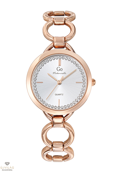 A GO órák világa friss, színes és harmonikus - a francia divatmárka modelljei letisztult eleganciát képviselnek. A tok és a hagyományos ékszercsat rozé arany színű IPRG bevonattal ellátott fémötvözet, a tok átmérője 30 mm. A fémszíjból 2 darab csatzár kivehető, így könnyedén, magunknak is méretre igazítható. Számlapja is rozé színű, cirkóniaköves perc-jelöléssel. Az üvege keményített ásványi üveg, mely ellenáll az enyhe súrlódásoknak, azok nem hagynak rajta nyomot. Japán Shiojiri szerkezet garantálja a megbízható pontosságot. Az óra szigetelése cseppálló, mely a kézmosáskor, esőben esetlegesen ráfröccsenő cseppektől véd, de vízbe nem vihető!