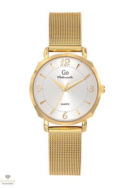 A GO órák világa friss, színes és harmonikus - a francia divatmárka modelljei letisztult eleganciát képviselnek. A tok sárga arany színű IPG bevonattal ellátott fémötvözet, átmérője 30 mm. Számlapja ezüst színű, 4 darab arab számos és 8 háromszög formájú indexszel. A nemesacél fémszíj szélessége 14 mm, mely biztonsági zárral kapcsolódik. Az üvege keményített ásványi üveg, mely ellenáll az enyhe súrlódásoknak, azok nem hagynak rajta nyomot. Japán Miyota 2035 szerkezet garantálja a megbízható pontosságot. Az óra szigetelése cseppálló, mely a kézmosáskor, esőben esetlegesen ráfröccsenő cseppektől véd, de vízbe nem vihető!