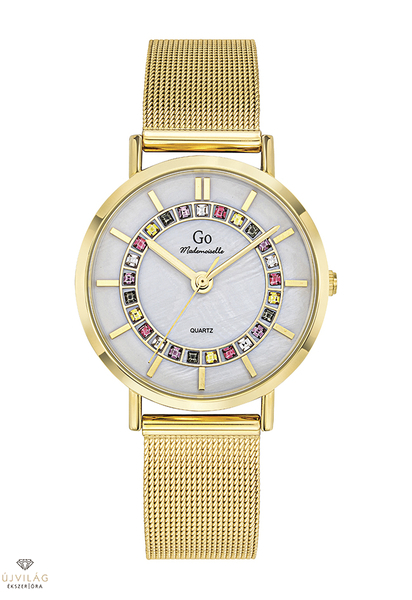 A GO órák világa friss, színes és harmonikus - a francia divatmárka modelljei letisztult eleganciát képviselnek. A tok sárga arany színű IPG bevonattal ellátott fémötvözet, átmérője 34 mm. Fehér-ezüst színű számlapját színes cirkónia kövek díszítik. A nemesacél fémszíj szélessége 16 mm, mely biztonsági zárral kapcsolódik. Az üvege keményített ásványi üveg, mely ellenáll az enyhe súrlódásoknak, azok nem hagynak rajta nyomot. Japán VJ21C3 szerkezet garantálja a megbízható pontosságot. Az óra szigetelése cseppálló, mely a kézmosáskor, esőben esetlegesen ráfröccsenő cseppektől véd, de vízbe nem vihető!