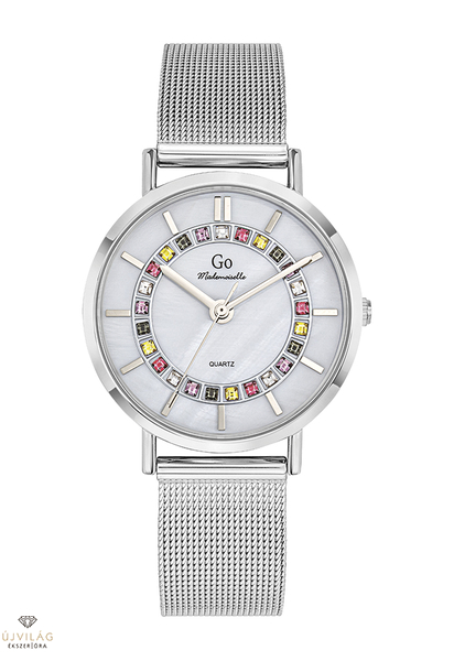 A GO órák világa friss, színes és harmonikus - a francia divatmárka modelljei letisztult eleganciát képviselnek. A tok ezüst színű IPS bevonattal ellátott fémötvözet, átmérője 34 mm. Fehér színű gyöngyház számlapját színes cirkónia kövek díszítik. A nemesacél fémszíj szélessége 16 mm, mely biztonsági zárral kapcsolódik. Az üvege keményített ásványi üveg, mely ellenáll az enyhe súrlódásoknak, azok nem hagynak rajta nyomot. Japán VJ21C3 szerkezet garantálja a megbízható pontosságot. Az óra szigetelése cseppálló, mely a kézmosáskor, esőben esetlegesen ráfröccsenő cseppektől véd, de vízbe nem vihető!