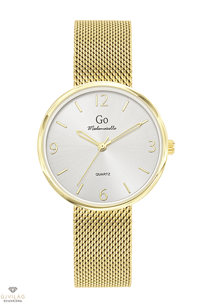 A GO órák világa friss, színes és harmonikus - a francia divatmárka modelljei letisztult eleganciát képviselnek. A tok sárga arany színű IPG bevonattal ellátott fémötvözet, átmérője 34 mm. Számlapja ezüst színű. A nemesacél fémszíj szélessége 16 mm, mely biztonsági zárral kapcsolódik. Az üvege keményített ásványi üveg, mely ellenáll az enyhe súrlódásoknak, azok nem hagynak rajta nyomot. Japán Miyota 2035 szerkezet garantálja a megbízható pontosságot. Az óra szigetelése cseppálló, mely a kézmosáskor, esőben esetlegesen ráfröccsenő cseppektől véd, de vízbe nem vihető!