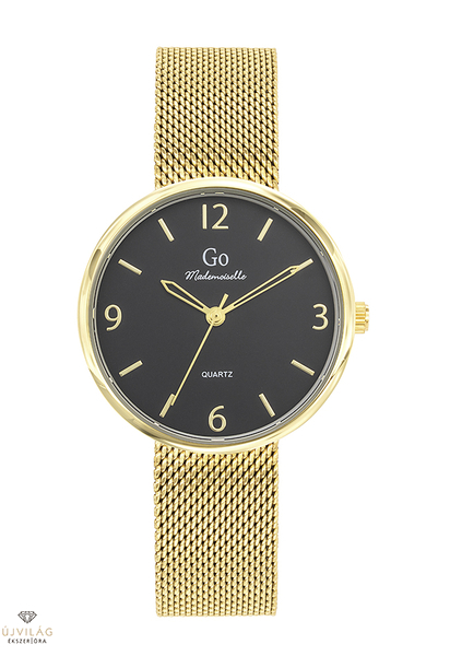 A GO órák világa friss, színes és harmonikus - a francia divatmárka modelljei letisztult eleganciát képviselnek. A tok sárga arany színű IPG bevonattal ellátott fémötvözet, átmérője 34 mm. Számlapja fekete színű. A nemesacél fémszíj szélessége 16 mm, mely biztonsági zárral kapcsolódik. Az üvege keményített ásványi üveg, mely ellenáll az enyhe súrlódásoknak, azok nem hagynak rajta nyomot. Japán Miyota 2035 szerkezet garantálja a megbízható pontosságot. Az óra szigetelése cseppálló, mely a kézmosáskor, esőben esetlegesen ráfröccsenő cseppektől véd, de vízbe nem vihető!