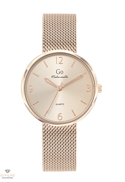 A GO órák világa friss, színes és harmonikus - a francia divatmárka modelljei letisztult eleganciát képviselnek. A tok rozé arany színű IPRG bevonattal ellátott fémötvözet, átmérője 34 mm. Számlapja is rozé színű. A nemesacél fémszíj szélessége 16 mm, mely biztonsági zárral kapcsolódik. Az üvege keményített ásványi üveg, mely ellenáll az enyhe súrlódásoknak, azok nem hagynak rajta nyomot. Japán Miyota 2035 szerkezet garantálja a megbízható pontosságot. Az óra szigetelése cseppálló, mely a kézmosáskor, esőben esetlegesen ráfröccsenő cseppektől véd, de vízbe nem vihető!