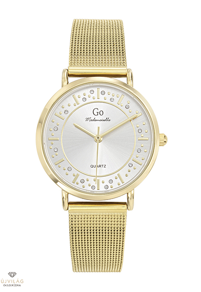 A GO órák világa friss, színes és harmonikus - a francia divatmárka modelljei letisztult eleganciát képviselnek. A tok sárga arany színű IPG bevonattal ellátott fémötvözet, átmérője 34 mm. Számlapja ezüst színű, cirkónia kövekkel díszítve. A nemesacél fémszíj szélessége 16 mm, mely biztonsági zárral kapcsolódik. Az üvege keményített ásványi üveg, mely ellenáll az enyhe súrlódásoknak, azok nem hagynak rajta nyomot. Japán Miyota 2035 szerkezet garantálja a megbízható pontosságot. Az óra szigetelése cseppálló, mely a kézmosáskor, esőben esetlegesen ráfröccsenő cseppektől véd, de vízbe nem vihető!