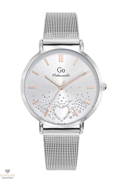 A GO órák világa friss, színes és harmonikus - a francia divatmárka modelljei letisztult eleganciát képviselnek. A tok ezüst színű IPS bevonattal ellátott fémötvözet, átmérője 36 mm. Számlapja ezüst színű, cirkónia kövekkel díszítve, rozé arany színű indexekkel, óramutatókkal. A nemesacél fémszíj szélessége 16 mm, mely biztonsági zárral kapcsolódik. Az üvege keményített ásványi üveg, mely ellenáll az enyhe súrlódásoknak, azok nem hagynak rajta nyomot. Japán Miyota 2035 szerkezet garantálja a megbízható pontosságot. Az óra szigetelése cseppálló, mely a kézmosáskor, esőben esetlegesen ráfröccsenő cseppektől véd, de vízbe nem vihető!