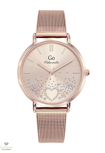 A GO órák világa friss, színes és harmonikus - a francia divatmárka modelljei letisztult eleganciát képviselnek. A tok rozé arany színű IPRG bevonattal ellátott fémötvözet, átmérője 36 mm. Számlapja is rozé arany színű, cirkónia kövekkel díszítve. A nemesacél fémszíj szélessége 16 mm, mely biztonsági zárral kapcsolódik. Az üvege keményített ásványi üveg, mely ellenáll az enyhe súrlódásoknak, azok nem hagynak rajta nyomot. Japán Miyota 2035 szerkezet garantálja a megbízható pontosságot. Az óra szigetelése cseppálló, mely a kézmosáskor, esőben esetlegesen ráfröccsenő cseppektől véd, de vízbe nem vihető!