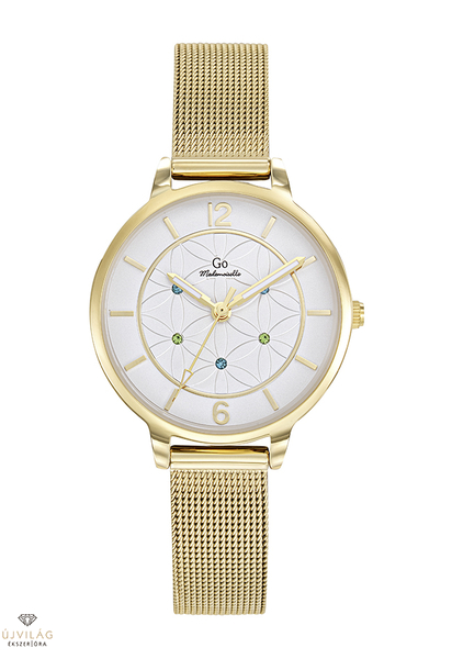 A GO órák világa friss, színes és harmonikus - a francia divatmárka modelljei letisztult eleganciát képviselnek. A tok sárga arany színű IPG bevonattal ellátott fémötvözet, átmérője 32 mm. Számlapja ezüst-fehér színű, homokfúvott virágmintával, cirkónia kövekkel díszítve, mely az Élet virága szimbólumot idézi. A nemesacél fémszíj szélessége 12 mm, mely biztonsági zárral kapcsolódik. Az üvege keményített ásványi üveg, mely ellenáll az enyhe súrlódásoknak, azok nem hagynak rajta nyomot. Japán VJ21C3 szerkezet garantálja a megbízható pontosságot. Az óra szigetelése cseppálló, mely a kézmosáskor, esőben esetlegesen ráfröccsenő cseppektől véd, de vízbe nem vihető!
