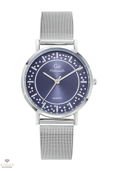 A GO órák világa friss, színes és harmonikus - a francia divatmárka modelljei letisztult eleganciát képviselnek. A tok ezüst színű IPS bevonattal ellátott fémötvözet, átmérője 34 mm. Számlapja kék színű, cirkónia kövekkel díszítve. A nemesacél fémszíj szélessége 16 mm, mely biztonsági zárral kapcsolódik. Az üvege keményített ásványi üveg, mely ellenáll az enyhe súrlódásoknak, azok nem hagynak rajta nyomot. Japán Miyota 2035 szerkezet garantálja a megbízható pontosságot. Az óra szigetelése cseppálló, mely a kézmosáskor, esőben esetlegesen ráfröccsenő cseppektől véd, de vízbe nem vihető!