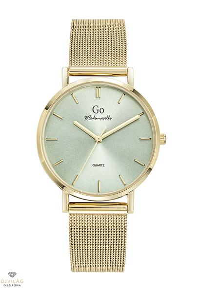 A GO órák világa friss, színes és harmonikus - a francia divatmárka modelljei letisztult eleganciát képviselnek. A tok sárga arany színű IPG bevonattal ellátott fémötvözet, átmérője 34 mm. Számlapja fémes, halványzöld árnyalatú. A nemesacél fémszíj szélessége 16 mm, mely biztonsági zárral kapcsolódik. Az üvege keményített ásványi üveg, mely ellenáll az enyhe súrlódásoknak, azok nem hagynak rajta nyomot. Japán Shiojiri VJ21 szerkezet garantálja a megbízható pontosságot. Az óra szigetelése cseppálló, mely a kézmosáskor, esőben esetlegesen ráfröccsenő cseppektől véd, de vízbe nem vihető!
