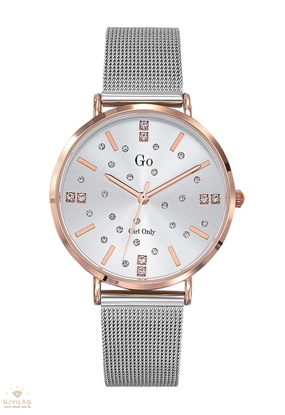 A GO órák világa friss, színes és harmonikus - a francia divatmárka modelljei letisztult eleganciát képviselnek. A tok rozé színű IPRG bevonattal ellátott fémötvözet, átmérője 36 mm. Ezüst színű számlapját cirkónia kövek és rozé indexek díszítik. Az ezüst színű nemesacél szövött fémszíj szélessége 16 mm, mely biztonsági zárral kapcsolódik. Az üvege keményített ásványi üveg, mely ellenáll az enyhe súrlódásoknak, azok nem hagynak rajta nyomot. Japán Miyota szerkezet garantálja a megbízható pontosságot. Az óra szigetelése cseppálló, mely a kézmosáskor, esőben esetlegesen ráfröccsenő cseppektől véd, de vízbe nem vihető!