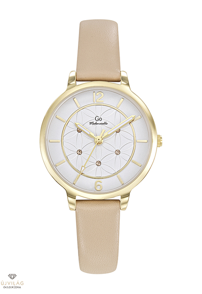 A GO órák világa friss, színes és harmonikus - a francia divatmárka modelljei letisztult eleganciát képviselnek. A tok sárga arany színű IPG bevonattal ellátott fémötvözet, átmérője 32 mm. Számlapja ezüst színű, homokfúvott virágmintával, cirkónia kövekkel díszítve, mely az Élet virága szimbólumot idézi. A halvány bézs árnyalatú bőrszíj szélessége 12 mm, zárszerkezete hagyományos tüskezár. Az üvege keményített ásványi üveg, mely ellenáll az enyhe súrlódásoknak, azok nem hagynak rajta nyomot. Japán VJ21C3 szerkezet garantálja a megbízható pontosságot. Az óra szigetelése cseppálló, mely a kézmosáskor, esőben esetlegesen ráfröccsenő cseppektől véd, de vízbe nem vihető!