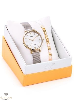 A GO órák világa friss, színes és harmonikus - a francia divatmárka modelljei letisztult eleganciát képviselnek. A tok sárga arany színű IPG bevonattal ellátott fémötvözet, átmérője 32 mm. Az ezüst színű nemesacél szövött fémszíj szélessége 12 mm, mely biztonsági zárral kapcsolódik. Az üvege enyhén domború, keményített ásványi üveg, mely ellenáll az enyhe súrlódásoknak, azok nem hagynak rajta nyomot. Japán Miyota szerkezet garantálja a megbízható pontosságot. Az óra szigetelése cseppálló, mely a kézmosáskor, esőben esetlegesen ráfröccsenő cseppektől véd, de vízbe nem vihető! Ráadásként ajándék karkötő jár a karórához.