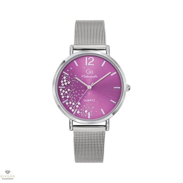 A GO órák világa friss, színes és harmonikus - a francia divatmárka modelljei letisztult eleganciát képviselnek. A tok ezüst színű IPS bevonattal ellátott fémötvözet, átmérője 36 mm. Lila színű számlapját cirkónia kövek díszítik. Az ezüst színű nemesacél szövött fémszíj szélessége 16 mm, mely biztonsági zárral kapcsolódik. Az üvege keményített ásványi üveg, mely ellenáll az enyhe súrlódásoknak, azok nem hagynak rajta nyomot. Japán Miyota szerkezet garantálja a megbízható pontosságot. Az óra szigetelése cseppálló, mely a kézmosáskor, esőben esetlegesen ráfröccsenő cseppektől véd, de vízbe nem vihető!