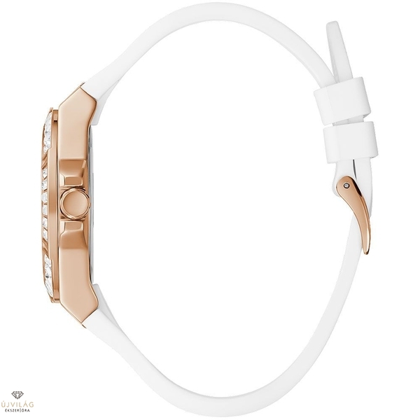A Guess Venus egy alkalmi óra, amely remekül mutat nőies stílusban. A termék fehér szilikon szíjjal és rózsaarany színű borítással rendelkezik, amelyhez kiváló minőségű rozsdamentes acélból készült. A kristályokkal díszített fehér számlapon Day Date időzítő és 24 órás időmérő található. A készülék kvarcművel működik. Funkciók: Dátum, Nap neve kijelzés, 24 órás kijelző