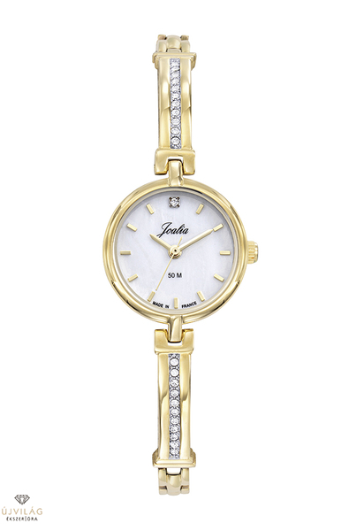 A francia JOALIA óramárka modelljei alkalmi viseletre ajánlott, hagyományos női ékszerórák. A fehér gyöngyház számlapos, kövekkel díszített elegáns női alkalmi karóra sárga arany színű IPG bevonatú rézből készült Franciaországban, a számlapon is látható MADE IN FRANCE felirattal. A tok szélessége 22 mm. Az óraszíj szélessége 5 mm, pattintós ékszeróra zárral kapcsolódik, melyből 2 csatszem kivehető, ezzel a fémszíj mérete csökkenthető. Japán Shiojiri szerkezet garantálja a megbízható pontosságot. Az üvege keményített ásványi üveg, mely ellenáll az enyhe súrlódásoknak, azok nem hagynak rajta nyomot. Az óra szigetelése cseppálló, mely a kézmosáskor, esőben esetlegesen ráfröccsenő cseppektől véd, de vízbe nem vihető!
