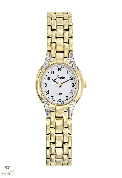 A francia JOALIA óramárka modelljei alkalmi viseletre ajánlott, hagyományos női ékszerórák. Az arany színű modell sárga arany színű IPG bevonatú rézből készült Franciaországban, a számlapon is látható MADE IN FRANCE felirattal, Swarovski kövekkel díszítve. A tok szélessége 22 mm. Az óraszíj pattintós ékszeróra zárral kapcsolódik, melyből 2 csatszem kivehető, ezzel a fémszíj mérete csökkenthető. Japán Shiojiri szerkezet garantálja a megbízható pontosságot. Az üvege keményített ásványi üveg, mely ellenáll az enyhe súrlódásoknak, azok nem hagynak rajta nyomot. Az óra szigetelése cseppálló, mely a kézmosáskor, esőben esetlegesen ráfröccsenő cseppektől véd, de vízbe nem vihető!