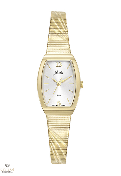 A francia JOALIA óramárka modelljei alkalmi viseletre ajánlott, hagyományos női ékszerórák. Franciaországban készült modell a számlapon is látható MADE IN FRANCE felirattal. Az óra sárga arany színe nagy kopásállóságú IPG bevonat. A nemesacél tok szélessége 19,5 mm, hosszúsága 27 mm. A nemesacél óraszíj szélessége 10 mm, ívesen elkeskenyedik 7 mm szélességig, beakasztós-pattintós zárral kapcsolódik, mely a mozgatható zárrésszel méretre igazítható. Japán Shiojiri szerkezet garantálja a megbízható pontosságot. Az üvege keményített ásványi üveg, mely ellenáll az enyhe súrlódásoknak, azok nem hagynak rajta nyomot. Az óra szigetelése cseppálló, mely a kézmosáskor, esőben esetlegesen ráfröccsenő cseppektől véd, de vízbe nem vihető!