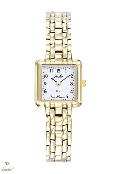A francia JOALIA óramárka modelljei alkalmi viseletre ajánlott, hagyományos női ékszerórák. A szögletes modell óratokja sárga arany színű IPG bevonatú rézből készült Franciaországban, a számlapon is látható MADE IN FRANCE felirattal. A tok szélessége 22 mm, hosszúsága 22 mm. Az IPG bevonatú réz fémszíj hagyományos pattintós zárral kapcsolódik, melyből 2 csatszem kivehető, ezzel a fémszíj mérete csökkenthető. Japán Shiojiri szerkezet garantálja a megbízható pontosságot. Az üvege keményített ásványi üveg, mely ellenáll az enyhe súrlódásoknak, azok nem hagynak rajta nyomot. Az óra szigetelése cseppálló, mely a kézmosáskor, esőben esetlegesen ráfröccsenő cseppektől véd, de vízbe nem vihető!