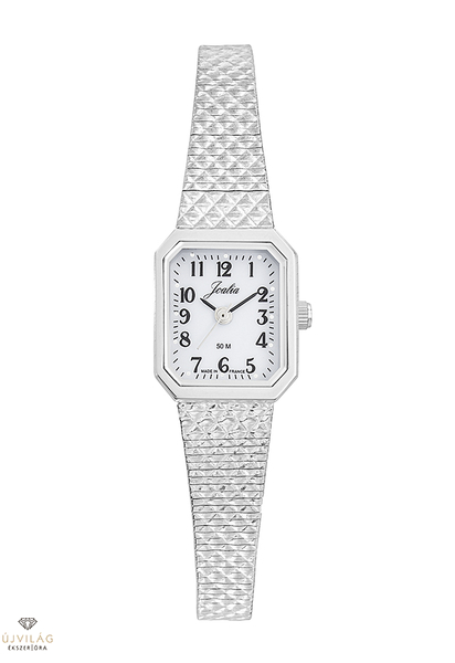 A francia JOALIA óramárka modelljei alkalmi viseletre ajánlott, hagyományos női ékszerórák. Franciaországban készült modell a számlapon is látható MADE IN FRANCE felirattal. A nemesacél tok szélessége 17 mm, hosszúsága 20 mm. A nemesacél óraszíj szélessége 11 mm, ívesen elkeskenyedik 6 mm szélességig, beakasztós-pattintós zárral kapcsolódik, mely a mozgatható zárrésszel méretre igazítható. Japán Miyota szerkezet garantálja a megbízható pontosságot. Az üvege keményített ásványi üveg, mely ellenáll az enyhe súrlódásoknak, azok nem hagynak rajta nyomot. Az óra szigetelése cseppálló, mely a kézmosáskor, esőben esetlegesen ráfröccsenő cseppektől véd, de vízbe nem vihető!