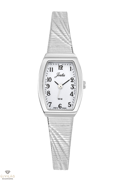 A francia JOALIA óramárka modelljei alkalmi viseletre ajánlott, hagyományos női ékszerórák. Franciaországban készült modell a számlapon is látható MADE IN FRANCE felirattal. A nemesacél tok szélessége 19,5 mm, hosszúsága 27 mm. A nemesacél óraszíj szélessége 10 mm, ívesen elkeskenyedik 7 mm szélességig, beakasztós-pattintós zárral kapcsolódik, mely a mozgatható zárrésszel méretre igazítható. Japán Shiojiri szerkezet garantálja a megbízható pontosságot. Az üvege keményített ásványi üveg, mely ellenáll az enyhe súrlódásoknak, azok nem hagynak rajta nyomot. Az óra szigetelése cseppálló, mely a kézmosáskor, esőben esetlegesen ráfröccsenő cseppektől véd, de vízbe nem vihető!