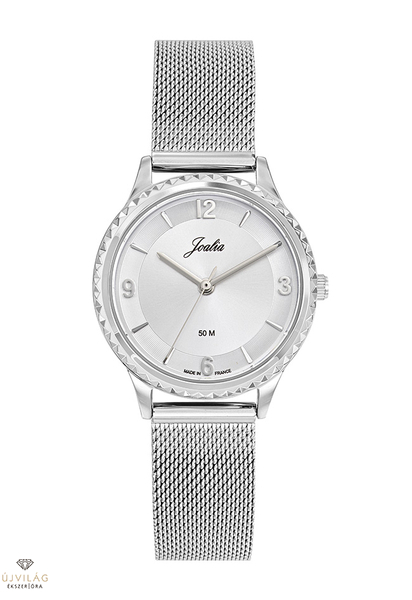 A francia JOALIA óramárka modelljei alkalmi viseletre ajánlott, hagyományos női ékszerórák. A milanéz szíjas modell óratokja ezüst színű IPS bevonatú rézből készült Franciaországban, a számlapon is látható MADE IN FRANCE felirattal, bordázott lünettel. A tok szélessége 30 mm, számlapja ezüst színű. A nemesacél fémszíj szélessége 14 mm, biztonsági zárral kapcsolódik, mely a mozgatható zárrésszel méretre igazítható. Japán Shiojiri szerkezet garantálja a megbízható pontosságot. Az üvege keményített ásványi üveg, mely ellenáll az enyhe súrlódásoknak, azok nem hagynak rajta nyomot. Az óra szigetelése cseppálló, mely a kézmosáskor, esőben esetlegesen ráfröccsenő cseppektől véd, de vízbe nem vihető!
