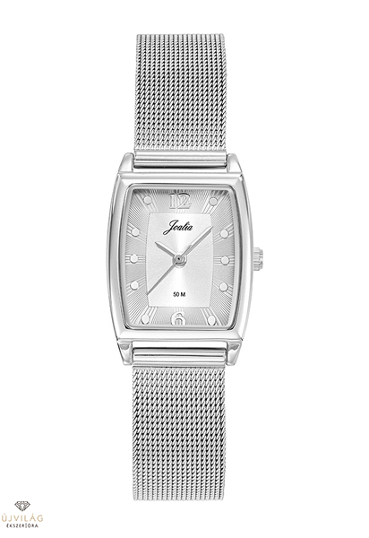 A francia JOALIA óramárka modelljei alkalmi viseletre ajánlott, hagyományos női ékszerórák. A szögletes modell óratokja ezüst színű IPS bevonatú rézből készült Franciaországban, a számlapon is látható MADE IN FRANCE felirattal. A tok szélessége 22 mm, hosszúsága 32 mm. A nemesacél fémszíj szélessége 14 mm, biztonsági zárral kapcsolódik, mely a mozgatható zárrésszel méretre igazítható. Japán Shiojiri szerkezet garantálja a megbízható pontosságot. Az üvege keményített ásványi üveg, mely ellenáll az enyhe súrlódásoknak, azok nem hagynak rajta nyomot. Az óra szigetelése cseppálló, mely a kézmosáskor, esőben esetlegesen ráfröccsenő cseppektől véd, de vízbe nem vihető!