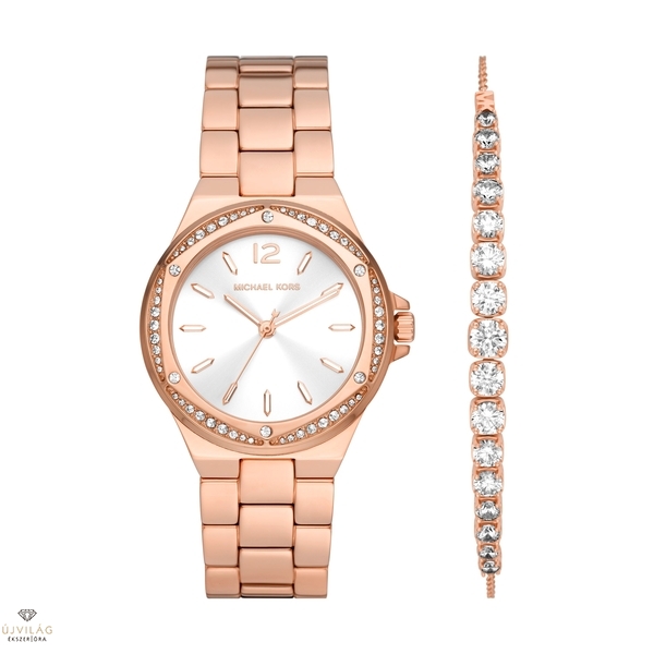 Ajándékozzon csillogást valakinek a Lennox óra és karkötő készlettel. A rózsa arany tónusú rozsdamentes acélból készült óra irizáló számlappal rendelkezik, amelyet csillogó pavé felső gyűrű veszi körül, amely elbűvölően megragadja a fényt. A koordináló ezüst tenisz karkötő egy sor csillogó akcentust tartalmaz egy finom láncon. Viselje együtt a tiédet a dupla luxusért.