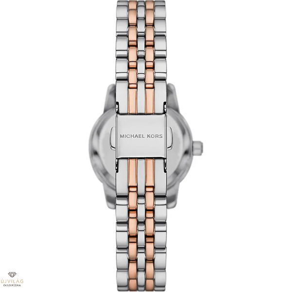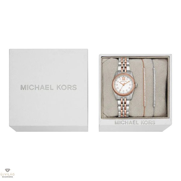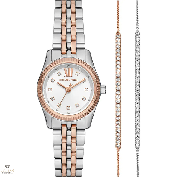 Ajándékozzon magának vagy szerettének eleganciát ezzel a 3 az 1-ben óraszettel. A karcsú, pavé ékezetekkel díszített számlap és a fazettált szíj polírozott felületet ad ennek az időtlen, kéttónusú rozsdamentes acélból készült karórának, míg a hozzá illő csúszókarperecek még inkább kiemelik a fényt. A két karkötő az órával szépen összecsomagolva, egy dobozban érkezik, így akár last minute ajándéknak is használható.