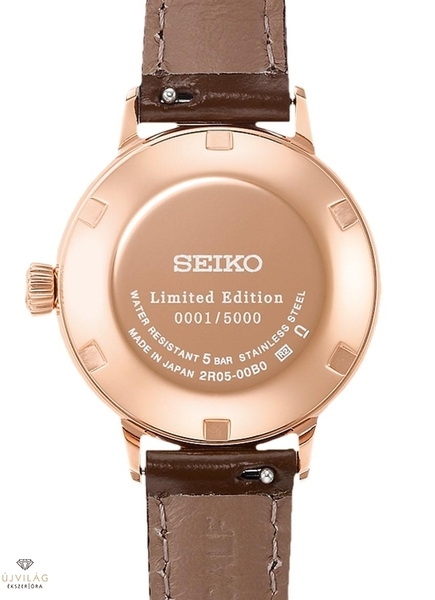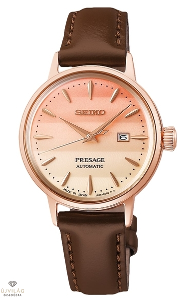 A Presage SRE014J1 egy hölgyek részére készült modell, 30.3 mm-es átmérővel. A tok, az indexek és a mutatók egyarányt rózsaarany színben készülnek, tökéletesen harmonizálva a számlap színeivel. A halvány rózsaszíntől a sárgáig tartó finom, fokozatos átmenet az égbolt színeit vonultatja fel, ahogy naplementekor még utoljára láthatóak. Az SRPE014J1 a nemesacél tokhoz bőr óraszíjat kapott, és 5000 darabos limitált kiadásként saját, egyedi díszdobozt is. A szerkezete a mérete miatt egy 2R05 mechanikus automata kaliber, amely kifejezetten a Presage női modellekhez készült.