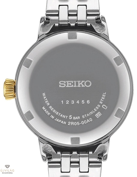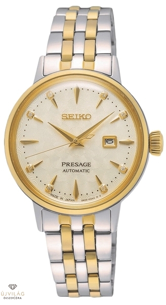 A női Presage modellek egy kicsit többet adnak, a megszokott minőség és műszaki színvonal mellett a design is különleges kell legyen. A SRE010J1 modell valóban különleges, hiszen ahogy a “Diamond Twist” is ígéri a nevében. Az óra számlapja 8 darab gyémántot kapott, szimmetrikusan elhelyezve az indexeknél, maguk a számla pedig egyedi struktúrájú, a mintázata egyszerre keleties és emlékeztet virágszirmokra is, így a gyémántokkal kiegészítve valódi nőies szépséget képviselnek. A számlap gyártásakor több rétegben átlátszó bevonatot visznek fel rájuk, majd ezt polírozzák simára és fényesre a különleges, csillogó hatás eléréséhez. Amodell a Cocktail Time sorozat stílusjegyeinek hordozója a “box shaped” formájú domború óraüveggel és a hegyes indexekkel és mutatókkal, ám női modellként 30 mm-es tokátmérővel készül, kényelmesen hordható méretben a finom női csuklókon is. Az óra új kalibert kapott, a 2R05 szerkezet kifejezetten női órák részére készült mechanikus automata kaliber dátum komplikációval. White Lady SRE010J1, az elegáns ragyogás arany színeiben. A számlap aranyos fénye az indexek, mutatók és a korona mellett a fémszíjon is visszatükröződik, az úgynevezett “two-tone” stílus az arany és a nemesacél elegáns kombinációja.