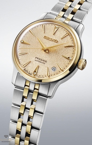 Az SRPL64J1a Daiquiri koktél fagyos változata ihlette, kellemesen aranyló részletekkel gazdagítva a klasszikusan nőies megjelenését. A női modell 34 mm-es méretével az igényes hölgyek számára készült. Klasszikus, kerek tokformáját domború Hardlex kristály óraüveg egészíti ki, elegáns és letisztult megjelenést kölcsönözve az órának.A számlap különleges, zúzott jeget idéző mintázatú, halványkék árnyalatban – a népszerű Skydiving koktél fagyos változata inspirálta. A fő indexeknél négy kőberakás emeli ki a nőies eleganciát. A dátumablak szokatlan módon 4 és 5 óra között, kerek formában jelenik meg, megőrizve a számlap szimmetriáját.A Presage Cocktail Time sorozatában megszokott és megbízható 4R35 kaliberrel készül, amely egy dátumkijelzés komplikációval ellátott mechanikus automata szerkezet.