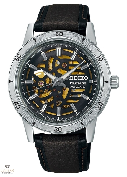 A Style 60’s sorozata a Presage modellek között egy új hangot képvisel, a kollekció hagyományosan elegánsabb vonalát egészíti ki egy sportos, mégis a mindennapokban bármely helyzetben viselhető darabokkal. Elegáns, de masszív motoros stílus - tökéletesen leírja ez a néhány szó a Presage SSA461J1 modellt. Az óra tokja nemesacélból készült, az üveg körüli ráma, más néven lünetta pedig ezt tükrözi.A különleges, áttört, sötét grafitszürke számlap mintázata egy korabeli motorkerékpár léghűtéses motorját formázza, ami mögött láthatjuk az arany színű kalibert dolgozni. A stílus korábban már bemutatkozott egy limitált Star Bar modellen, most pedig egy férfiasabb megjelenésben hozza vissza a benzingőzös hatvanas éveket. A 4R72 szerkezet a 4R család tagja, klasszikus mechanikus automata, megbízható és sokat bizonyított. Amiben más és amiben több, mint az átlagos kaliberek, az egyrészről az arany színe, másrészről az open heart kaliberekhez hasonló megoldása, amellyel egy-egy ponton átlátunk a szerkezeten, éppen, mint egy skeleton modellnél.