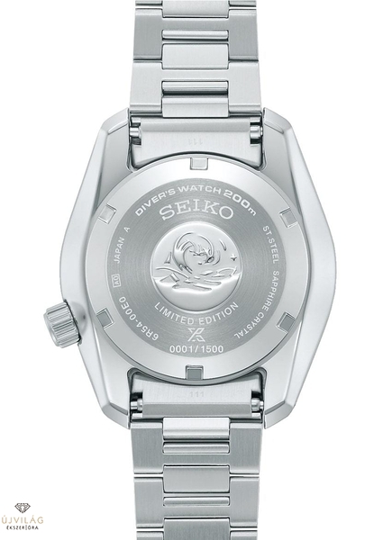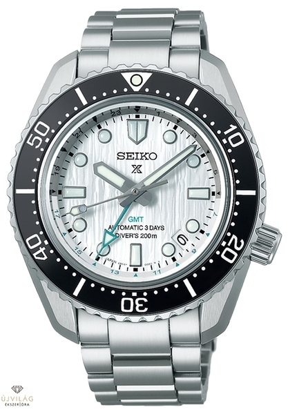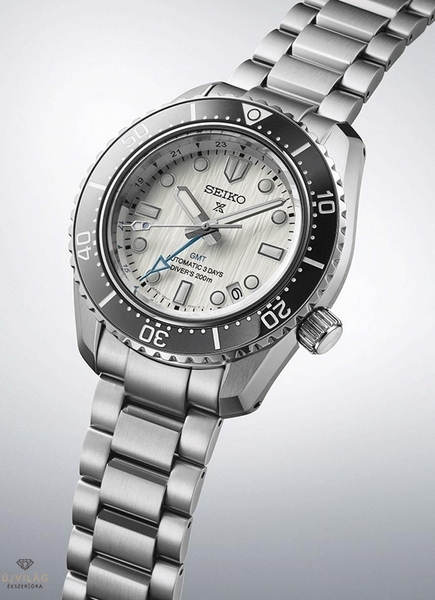 1500 darabos limitált kiadású Prospex Save The Ocean modell.Az SPB439J1 texturált számlapja egy jéggleccser felszínét ábrázolja, míg a GMT mutató és a 24 órás skála feltűnő """"Arctic Blue"""" árnyalatú, hogy a zord tengerre hasonlít. 6R54 kaliber az első Seiko Prospex Diver mechanikus GMT szerkezet, amely GMT funkcióval és háromnapos járástartalékkal rendelkezik. A GMT funkcionalitás lehetővé teszi viselője számára, hogy egyszerre több időzónát is nyomon kövessen. Az egyirányba forgatható lünetta kerámia betéttel rendelkezik. A Prospex a 'Professional' és a 'Specifications' szavak kombinációja. A Seiko Prospex időmérőket úgy tervezték, hogy praktikusak, megbízhatóak és tartósak legyenek"