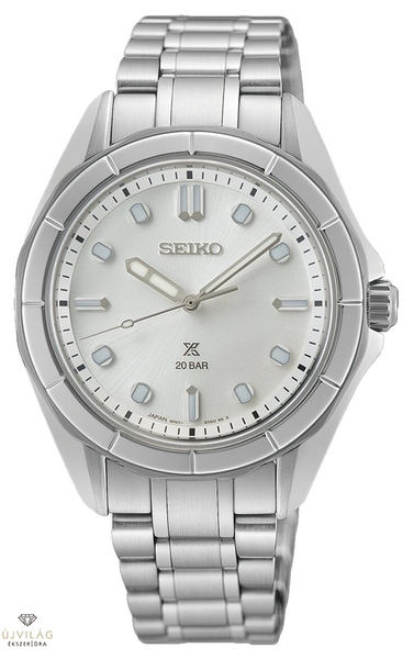 A Seiko Prospex SUR595J1 a Marine Sports kollekció letisztult és elegáns darabja. 34 mm-es rozsdamentes acél tokja alatt a megbízható 6N01 kvarc szerkezet működik, amely hároméves járástartalékot biztosít. A fényes, ezüstfehér számlapot Lumibrite bevonatú mutatók és indexek teszik könnyen leolvashatóvá, még sötétben is. A zafírüveg és a 200 méteres vízállóság sportos megbízhatóságot nyújt, miközben a finom vonalvezetés nőies eleganciát sugároz.
