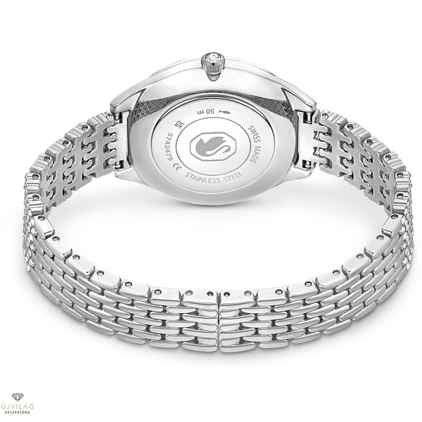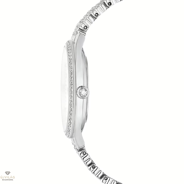 A 433 kristály lenyűgöző felhasználásának köszönhetően ez a svájci gyártmányú óra gyönyörűen emeli ki a rozsdamentes acél egyszerűségét. Az ezüstszínű guilloche számlapon kristálybeosztások láthatók, míg a karcsú lünetta és a karkötő egyaránt káprázatos, átlátszó kristályból készült pavédíszítéssel van ellátva. A 30 mm-es óra 50 méterig vízálló, és a felhúzó koronáján egyetlen kő található. Finom, mégis látványos benyomást kelt bármilyen öltözékkel viselve.