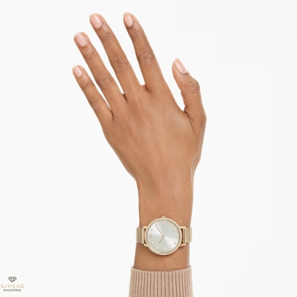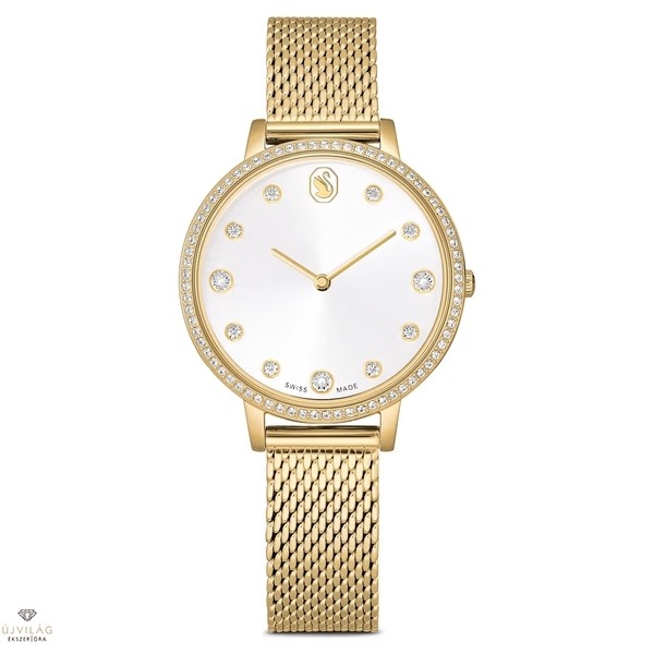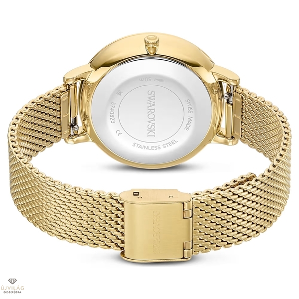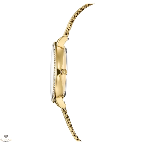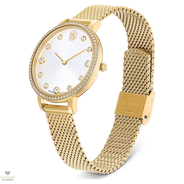 Ez az elegáns Clarica óra jellegzetes Milanese karkötőjével tűnik ki, amely feltűnő hálós stílusban öleli körül a csuklót. A 35 mm-es, rozsdamentes acélból készült, arany tónusú bevonatos darab tökéletesen kerek lünettával rendelkezik, amelyet 73 átlátszó kristály díszít. Az óra napsugaras számlapján 11 kristálybeosztás, valamint egy hattyú embléma látható 12 óránál. Ez a svájci gyártmányú óra 50 méterig vízálló, és klasszikus választás a mindennapi luxushoz. Óraház mérete: 35 x 35 mm. Óraház vastagsága: 9 mm. Óraszíj hossza (min. - max.): 12.5 - 19 cm. Óraszíj szélessége: 14 mm.