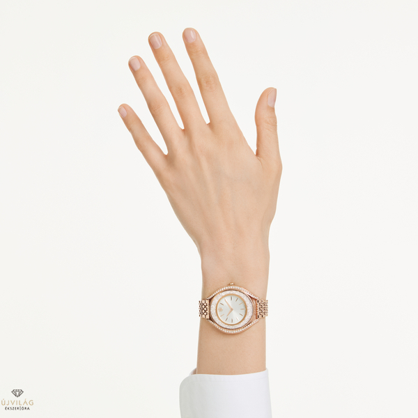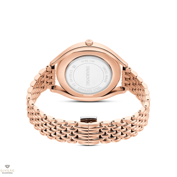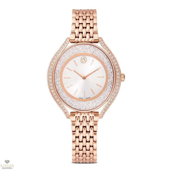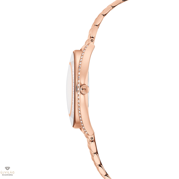 Ez az ívelt Crystalline óra művészien ötvözi az eleganciát és a praktikus funkciókat. Körülbelül 1380 kristály díszíti a rózsaarany tónusú bevonattal készült óraházat. A kifinomult darabot fém karkötő, ezüstös napsugaras számlap és a 12 óránál elhelyezett Swarovski hattyú teszi teljessé. Ez a svájci gyártmányú óra 50 méterig vízálló.