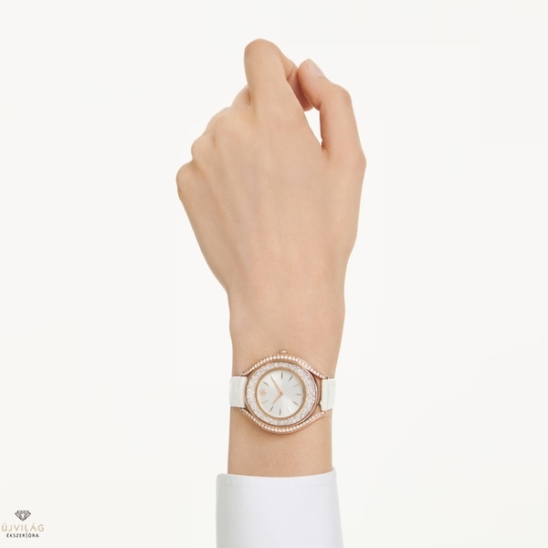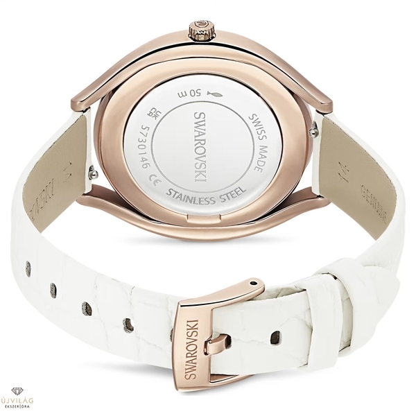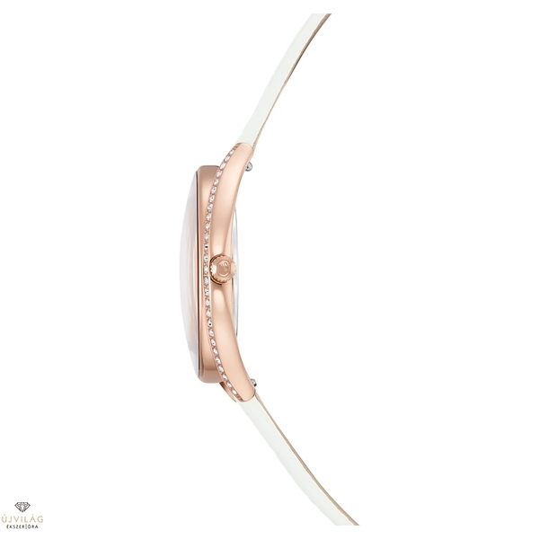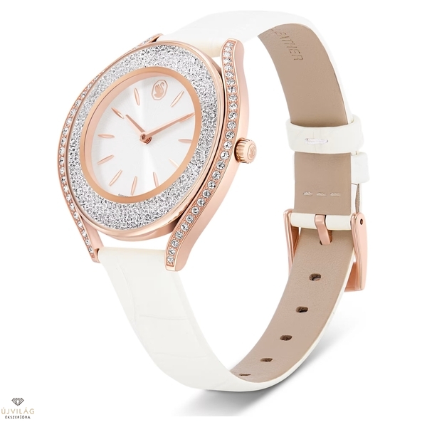 Ez az ívelt Crystalline óra művészien ötvözi az eleganciát és a praktikus funkciókat. Körülbelül 1380 kristály díszíti a rózsaarany tónusú bevonattal készült óraházat. A kifinomult darabot fehér bőrszíj, ezüstös napsugaras számlap és a 12 óránál elhelyezett Swarovski hattyú teszi teljessé. Ez a svájci gyártmányú óra 50 méterig vízálló. Óraház mérete: 40 x 35 mm. Óraház vastagsága: 9 mm. Óraszíj hossza (min. - max.): 15.5 - 18.5 cm. Óraszíj szélessége: 14 mm.