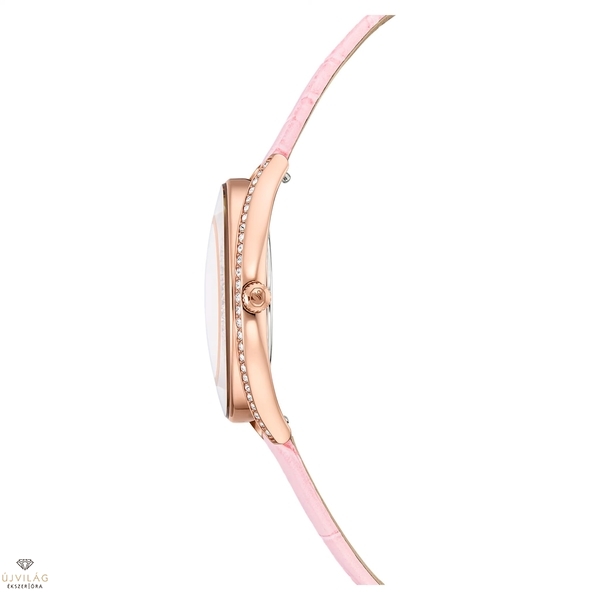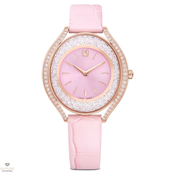 Ez az ívelt Crystalline óra művészien ötvözi az eleganciát és a praktikus funkciókat. Körülbelül 1380 kristály díszíti a rózsaarany tónusú bevonattal készült óraházat. A kifinomult darabot rózsaszín bőrszíj, rózsaszín napsugaras számlap és a 12 óránál elhelyezett Swarovski hattyú teszi teljessé. Ez a svájci gyártmányú óra 50 méterig vízálló. Óraház mérete: 40 x 35 mm. Óraház vastagsága: 9 mm. Óraszíj hossza (min. - max.): 15.5 - 18.5 cm. Óraszíj szélessége: 14 mm.