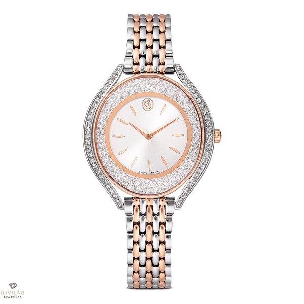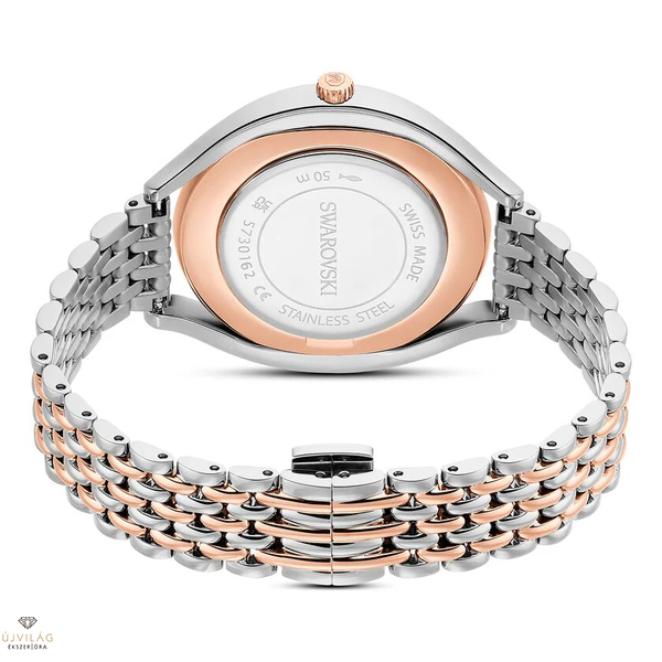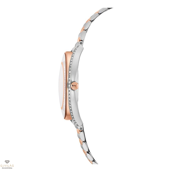 Ez az ívelt Crystalline óra művészien ötvözi az eleganciát és a praktikus funkciókat. Körülbelül 1380 kristály díszíti a kétszínű darabot, amely rozsdamentes acélból és rózsaarany tónusú bevonattal készült. A kifinomult órát fém karkötő, ezüstös napsugaras számlap és a 12 óránál elhelyezett Swarovski hattyú teszi teljessé. Ez a svájci gyártmányú óra 50 méterig vízálló. Óraház mérete: 40 x 35 mm. Óraház vastagsága: 9 mm. Óraszíj hossza (min. - max.): 15.5 - 18.5 cm. Óraszíj szélessége: 14 mm.