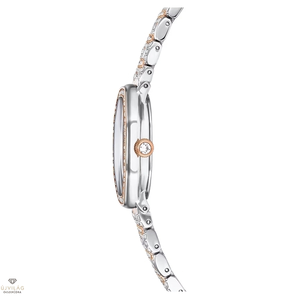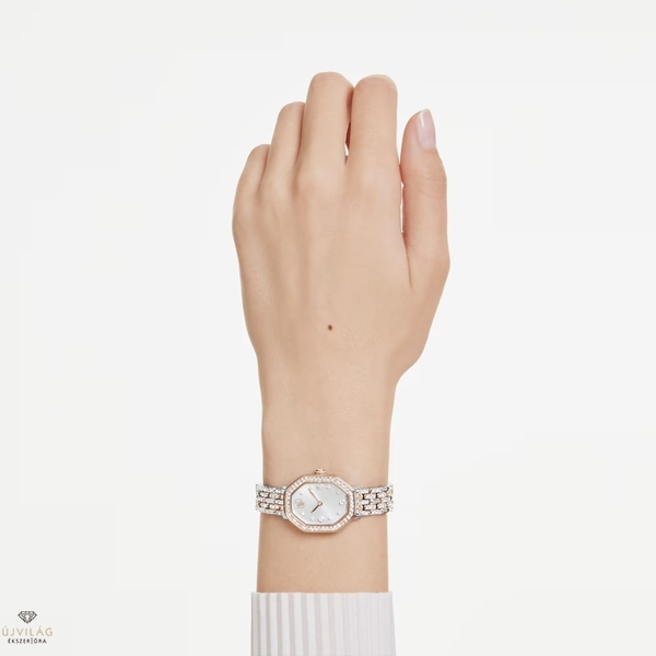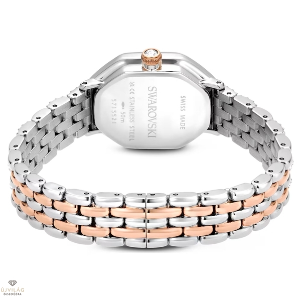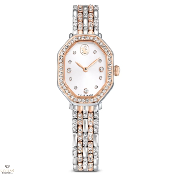 A Dextera család időtlen eleganciája ihlette ezt a 18 x 23 mm-es órát, amelyet egyedi módon, a Swarovski ikonikus nyolcszögletű formájában készítettek. A rozsdamentes acél és a rózsaarany-tónusú bevonat ötvözetéből készült óra formavilágának része a 46 kristállyal kirakott pavé foglalat, valamint a felhúzó koronába foglalt kristály. A napsugaras számlapon finom kristályindexek, karcsú mutatók és a 12 óránál elhelyezett hattyúlogó látható. A ragyogó alkotást az öt láncszemből álló, 108 kerek metszésű kristállyal díszített karkötő teszi teljessé, amely minden órában végtelen csillogást biztosít. Ez a svájci gyártmányú óra 50 méterig vízálló. Méretek: Óraház mérete: 32 x 23 mm. Óraház vastagsága: 7 mm. Óraszíj hossza (min. - max.): 12.5 - 19 cm. Óraszíj szélessége: 1.1 cm